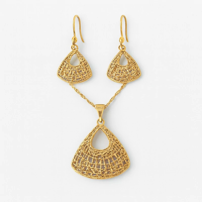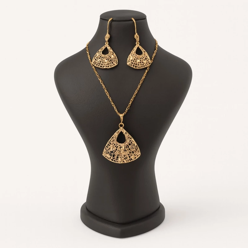 نیم ست زنانه مدل توری کد G10 مشخصات فنی محصول: ** مشخصات ** نوع ست زیورآلات زنانه: نیم ست زیورآلات اقلام ست: گردنبند, گوشواره جنس: استیل, آبکاری طلا وزن انگشتر: 50 گرم